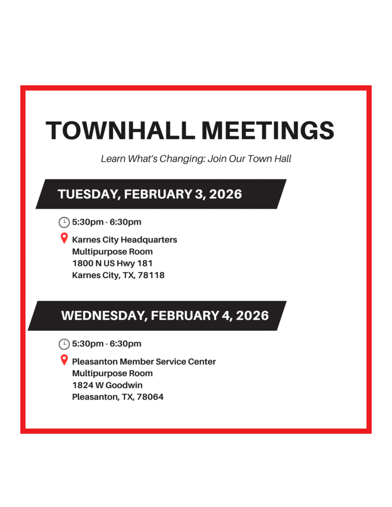 If you have any questions or would like to talk through the changes, please don’t hesitate to call us at 888-807-3952. We also invite you to attend our upcoming public meetings to learn more and share your thoughts. Details on dates on dates and locations are listed below. View our January issue of Texas Co-op magazine here.